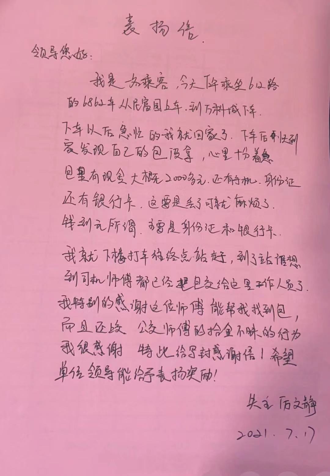 “到家后,我發(fā)現(xiàn)包不見,于是抱著試試看的心態(tài),來到九里停車場(chǎng)調(diào)度室詢問,沒想到好心的公交司機(jī)幫我找到了。”厲大姐緊握王師傅的手連聲致謝,當(dāng)場(chǎng)寫下了一封表?yè)P(yáng)信。
