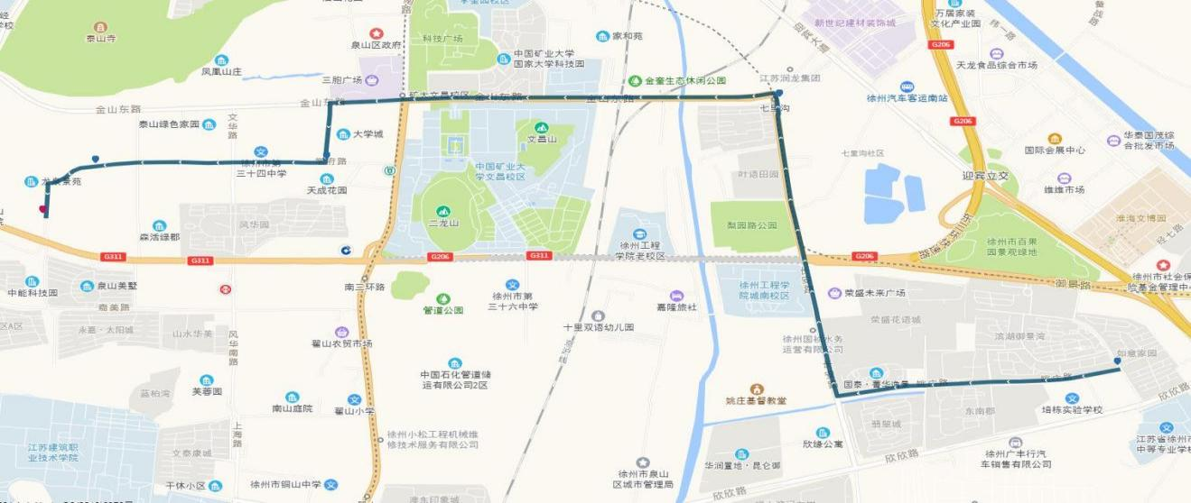 線路站點(diǎn):御景灣公交首末站、濱湖御景灣南門(mén)、姚莊街坊中心、欣欣路口、七里溝地鐵站、礦大北門(mén)、大學(xué)城、天成花園、三十四中、三十中附小、泉泰嘉苑、泉山美墅西門(mén)(路西,單向)、碧水灣小區(qū)(路北、單向)、泉山法院(路南,單向)。備注:因目前雙山路與三環(huán)南路交叉口正在施工,公交車輛無(wú)法通行,319路暫時(shí)僅運(yùn)行至泉泰嘉苑。待道路貫通后,進(jìn)行全線路運(yùn)營(yíng)。