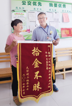 7月21日《都市晨報(bào)》A08版刊登了《急匆匆出門見(jiàn)朋友 3000多元現(xiàn)金遺失公交上》一文,講述了8路駕駛員潘要來(lái)拾金不昧的事跡。7月19日下午,家住銅山區(qū)大彭鎮(zhèn)的蔡女士從大彭鎮(zhèn)乘坐8路車到宣武,慌忙下車后,蔡女士忽然發(fā)現(xiàn)裝3000多元錢的布包不見(jiàn)了。兩人回憶,當(dāng)時(shí)忙著抱孩子了,把包遺失在了公交車上。蔡女士連忙回去,找到另外一名8路車駕駛員幫她聯(lián)系了8路調(diào)度室,很快傳來(lái)好消息:包找到了。原來(lái),蔡女士乘坐的8路車駕駛員潘要來(lái)看到了座位上有一個(gè)東西,當(dāng)時(shí)他誤認(rèn)為是坐墊,后來(lái),他看到有個(gè)乘客直接奔向那個(gè)座位,一屁股坐了下來(lái),神色有些慌張。潘師傅從后視鏡看到,那個(gè)東西鼓鼓囊囊不像坐墊,便走了過(guò)去,將包拿回駕駛室。