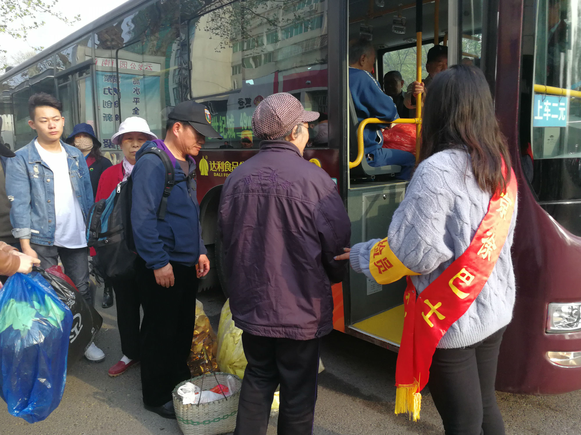 云龍公園南門,站滿了拿著大包小包的乘客?!按蠹遗藕藐牐⒁獍踩?,不要擁擠,需要換零錢的乘客可以到零幣兌換處換取零錢?!敝驹刚呶⑿χS持現(xiàn)場秩序。人群中有位提著兩個大包裹的大媽,志愿者走到大媽跟前,關(guān)切地詢問:“大媽,我來幫您把包裹拿上車吧?!敝驹刚咭皇?jǐn)v扶老人上車,一手拿著物品,為其安排好座位并叮囑大媽注意安全。一班車走后,還沒撈著喝口水,現(xiàn)場又聚滿了乘客,志愿者們又開始忙碌起來:“大爺,車還要一會才能來,您先坐這歇一會吧?!敝驹刚吣脕戆宓剩尷洗鬆斪滦菹?,老大爺十感動,說道:“你們真貼心。